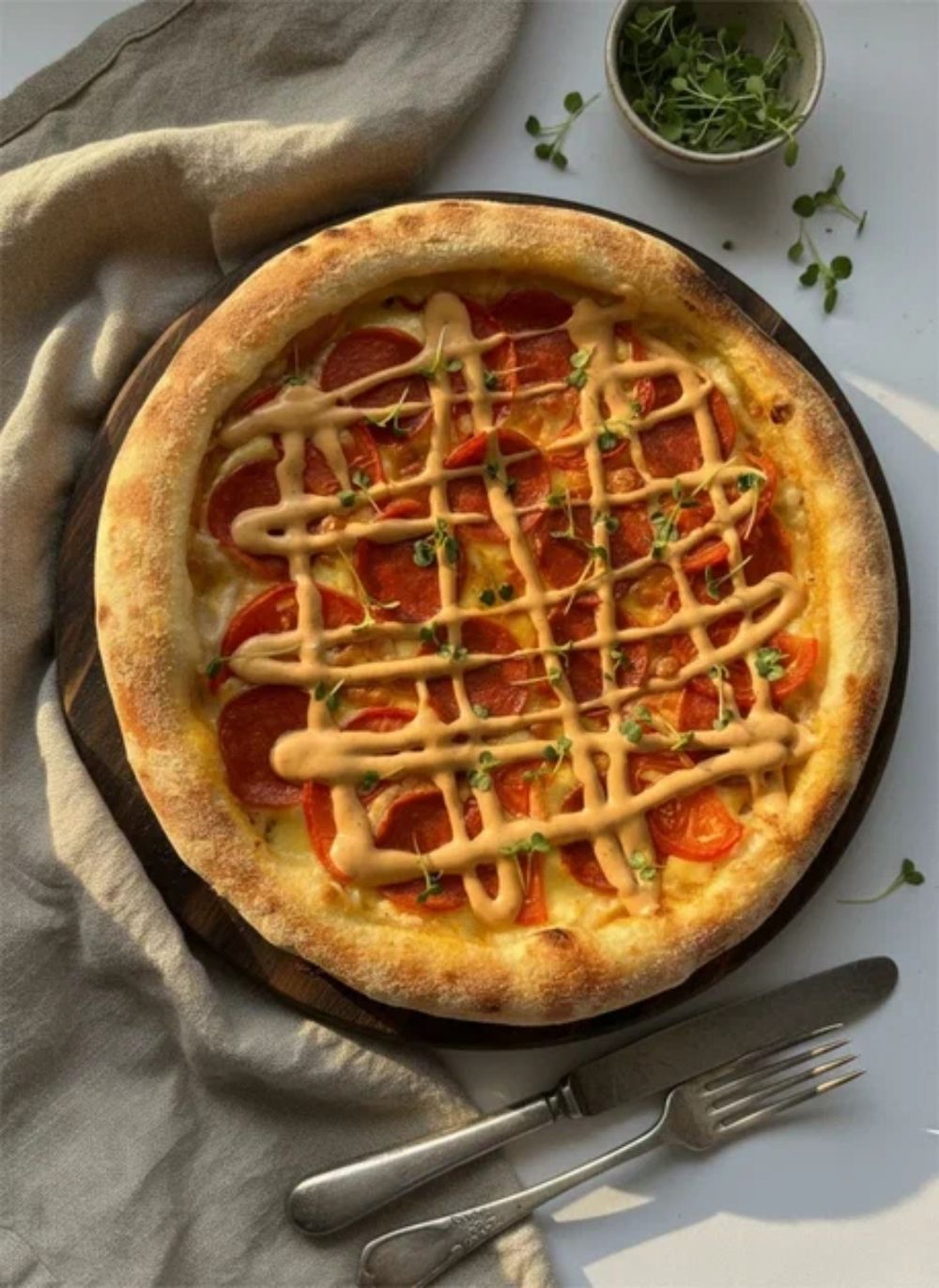 Белый соус,сыр моцарелла,пепперони,томаты,соус гриль,микрозелень (33 см). НА ДАННУЮ ПОЗИЦИЮ СПИСАНИЕ БАЛЛОВ ЗАПРЕЩЕНО!!!