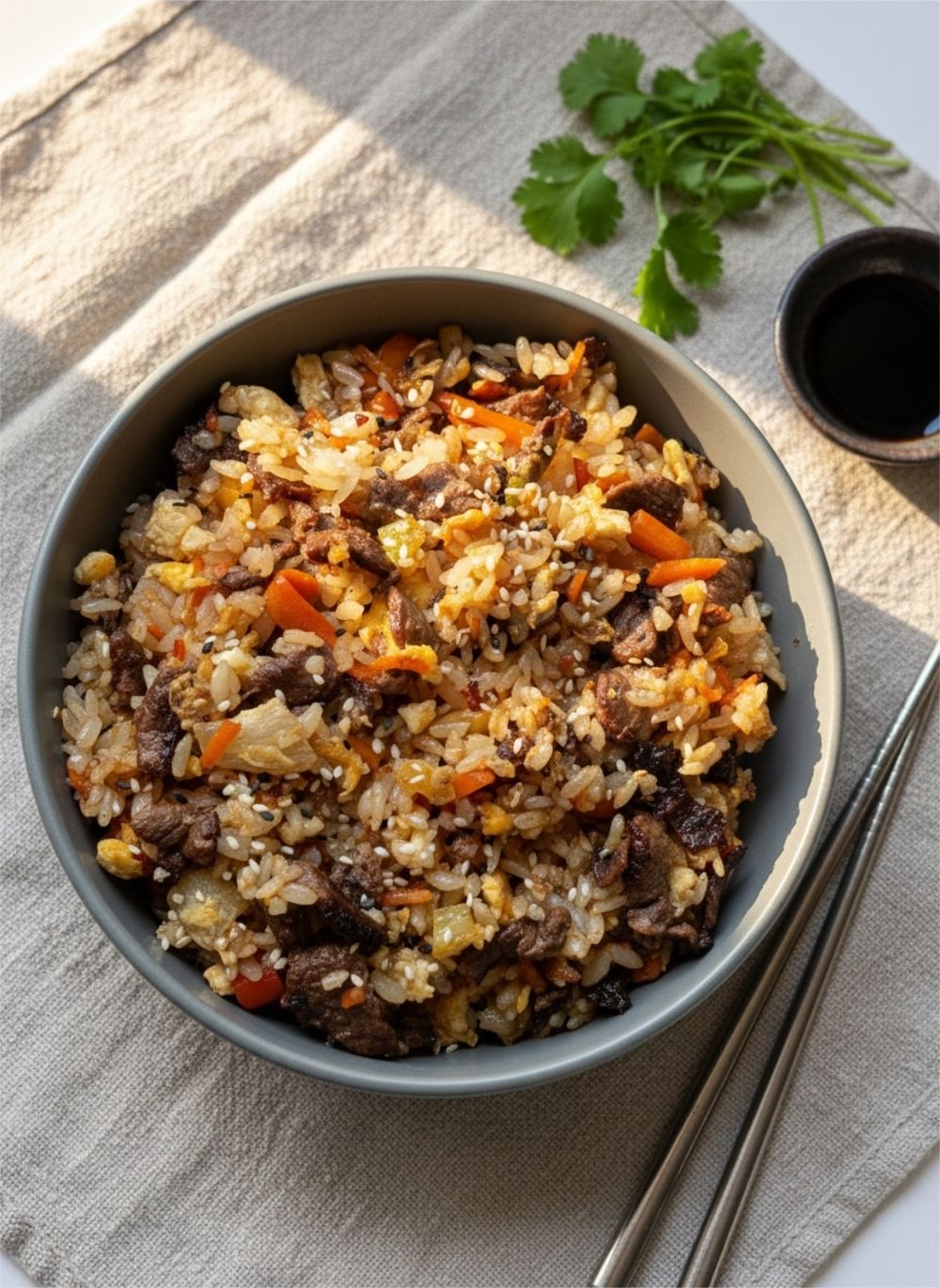 Рис,говядина,болгарский перец, морковь,лук,яйцо,чесночное масло,соус соевый,кунжутное масло,кунжут