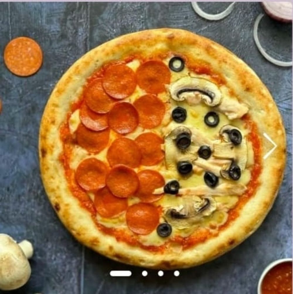 Пицца-соус,сыр моцарелла,шампиньоны,куриное филе,маслины,пеперони (25 см).