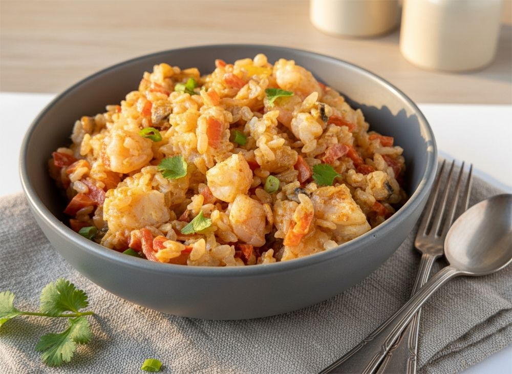 Рис,тигровые креветки,лук,морковь,болгарский перец,шампиньоны,чеснок,корень имбиря,паста том ям,сливки,кинза.