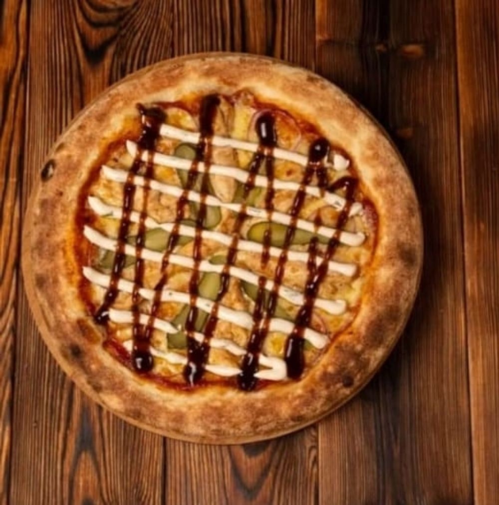 Пицца-соус,сыр мацарелла,куриное филе,корнишоны,красный лук,соус Барбекю,соус Цезарь (33 см).