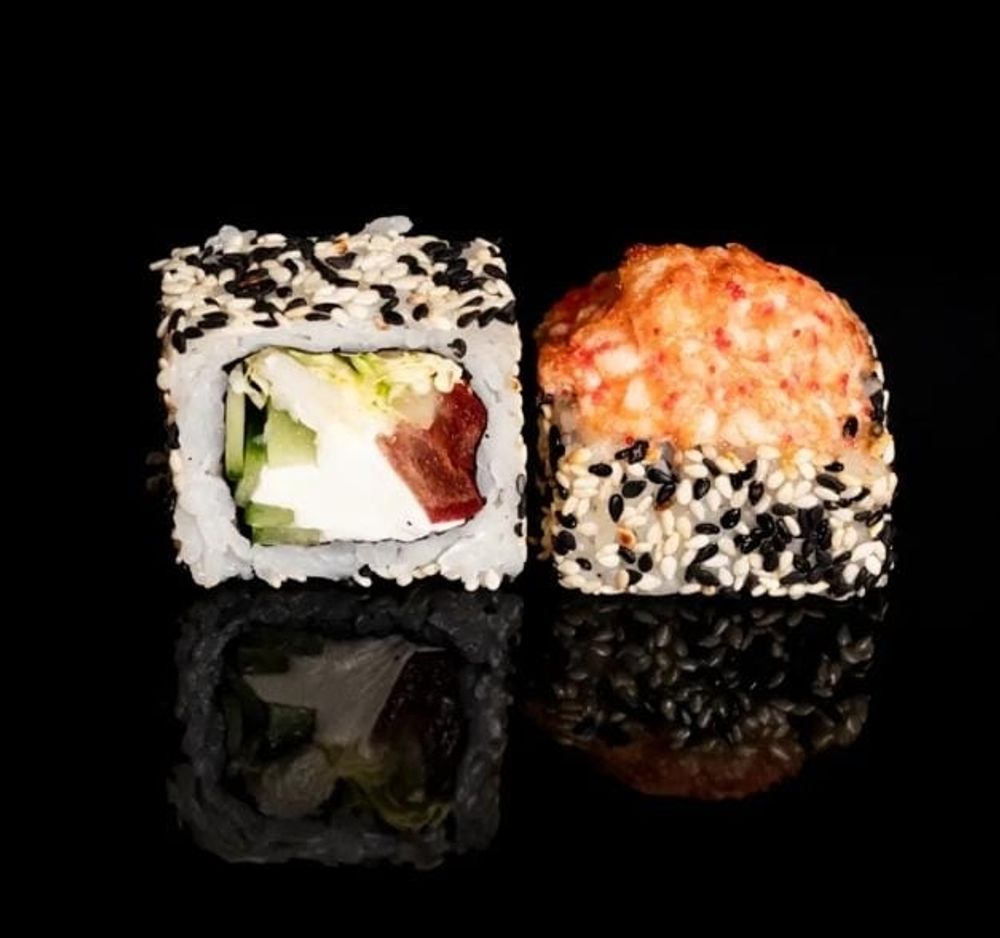 Грудка отварная,томаты,огурец,лист салата,сливочный сыр,соус-спайси,кунжут (8 шт.)