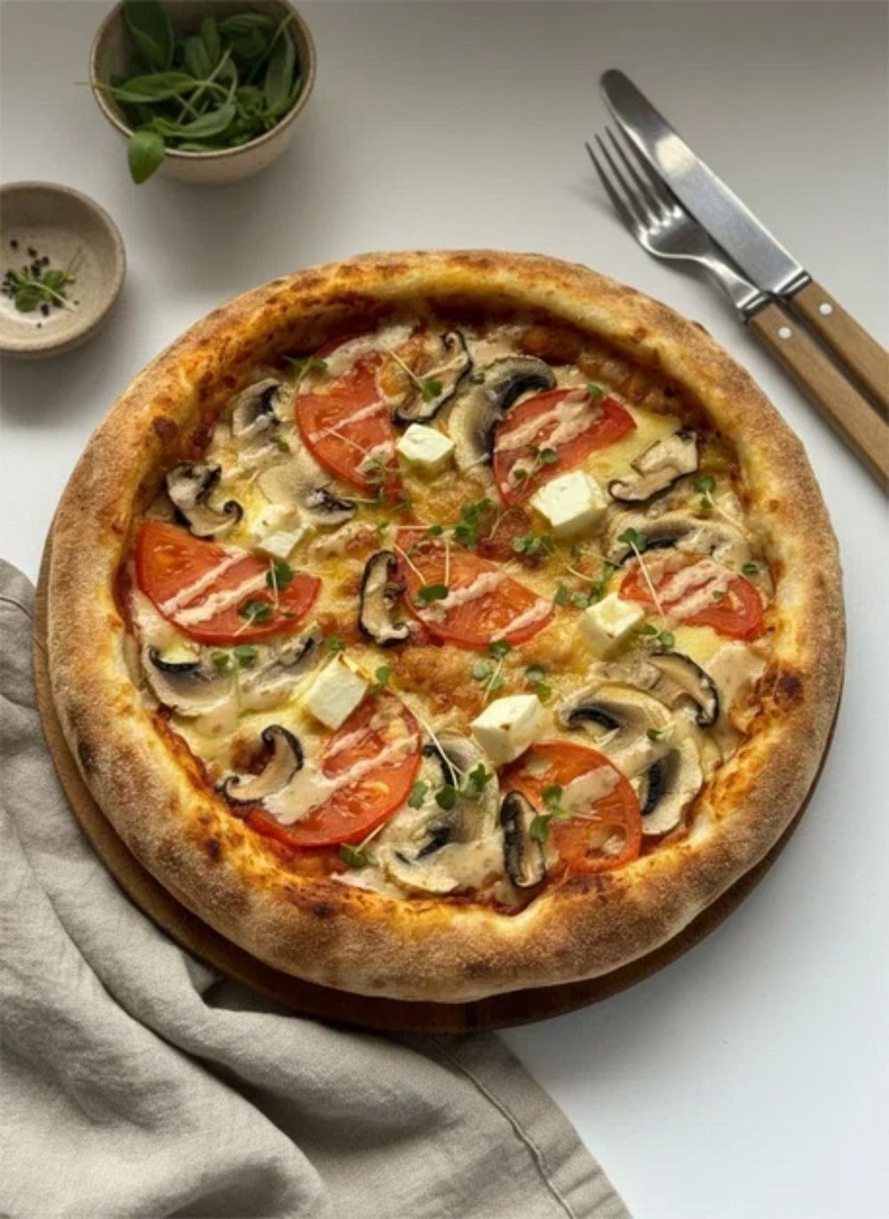 Пицца-соус,сыр моцарелла,томаты,грибы шиитаке,грибы шампиньоны,сыр тофу,соус кунжутный,микрозелень (33 см).