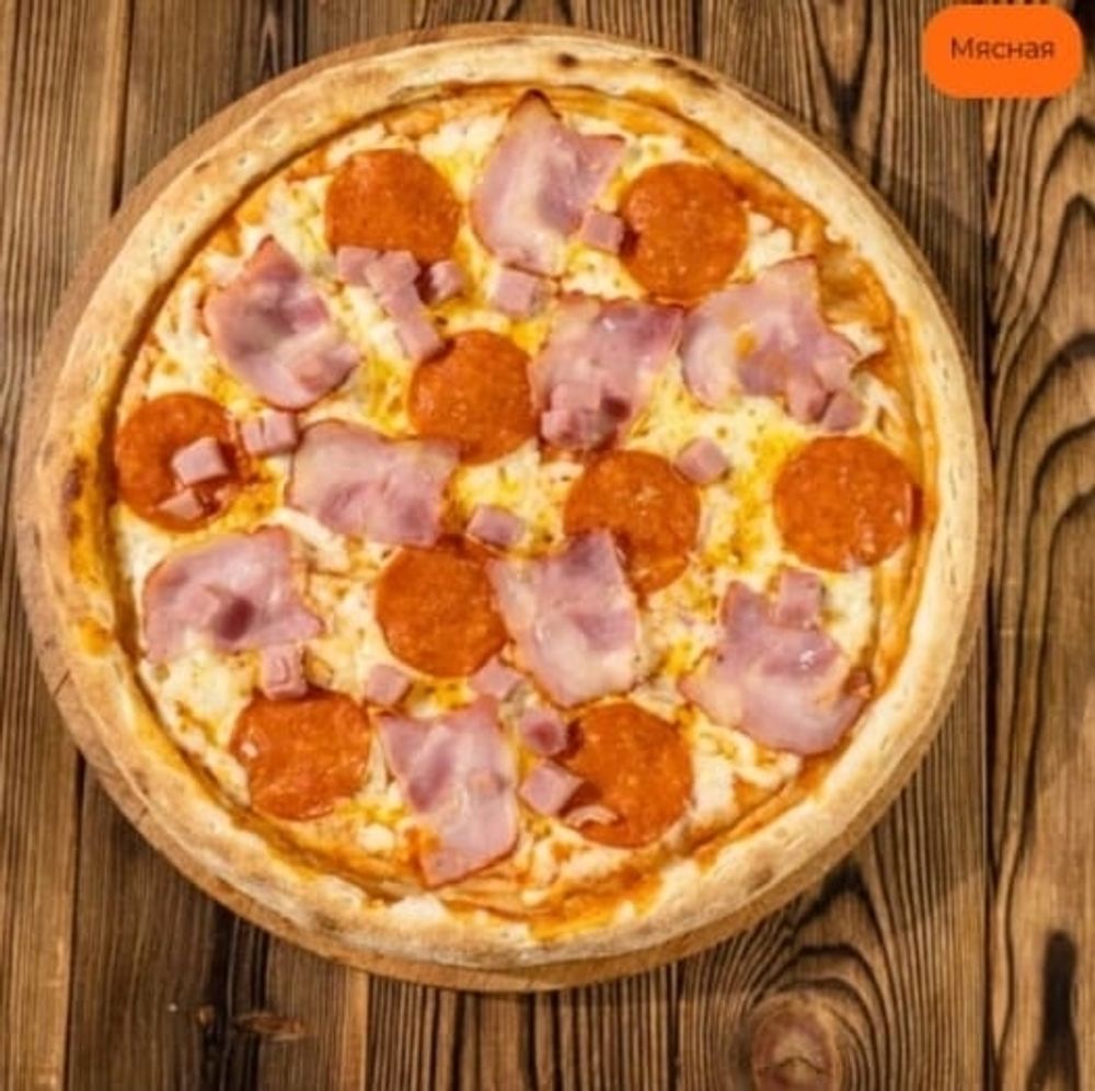 Пицца-соус,сыр моцарелла,бекон,ветчина,колбаски пеперони (33 см).