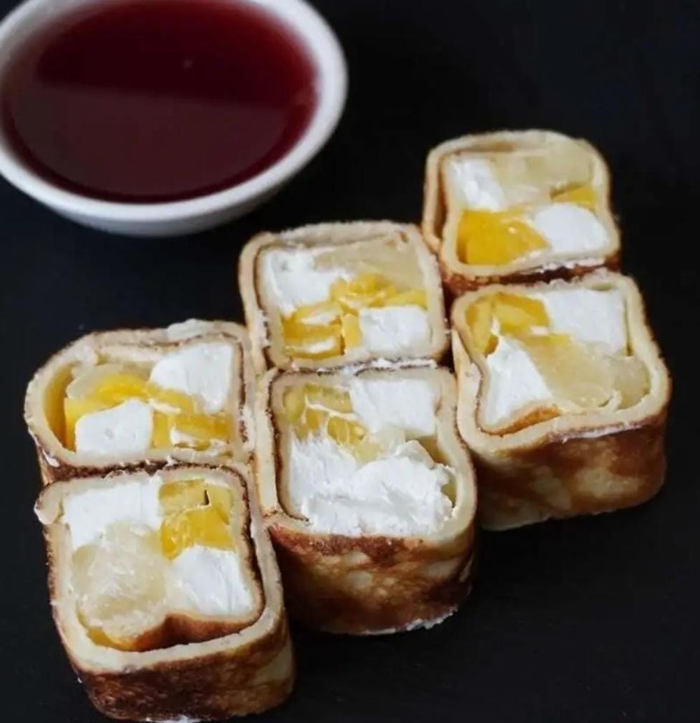 Блин,сладкий творожный сыр,манго,ананас, сироп гренадин подается отдельно