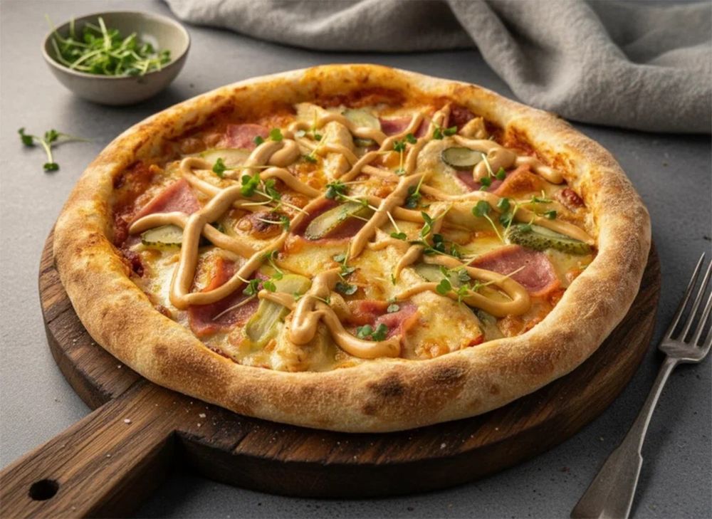Пицца соус,сыр моцарелла,курица маринованная,огурцы маринованные,ветчина,лук репчатый,соус гриль,микрозелень (25 см).